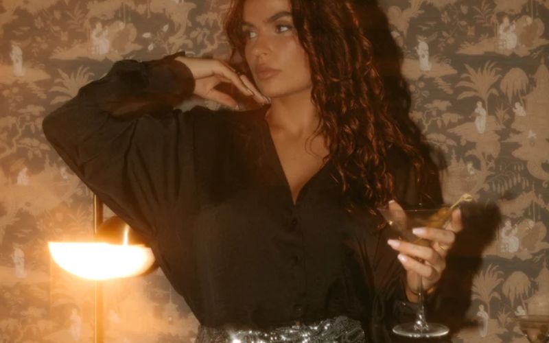 Silkki- tai satiinipaita näyttävillä koruilla, työnnettynä korkeavyötäröiseen hameeseen tai elegantteihin housuihin. Harkitse ylimääräisen napin avaamista iltatilanteissa.