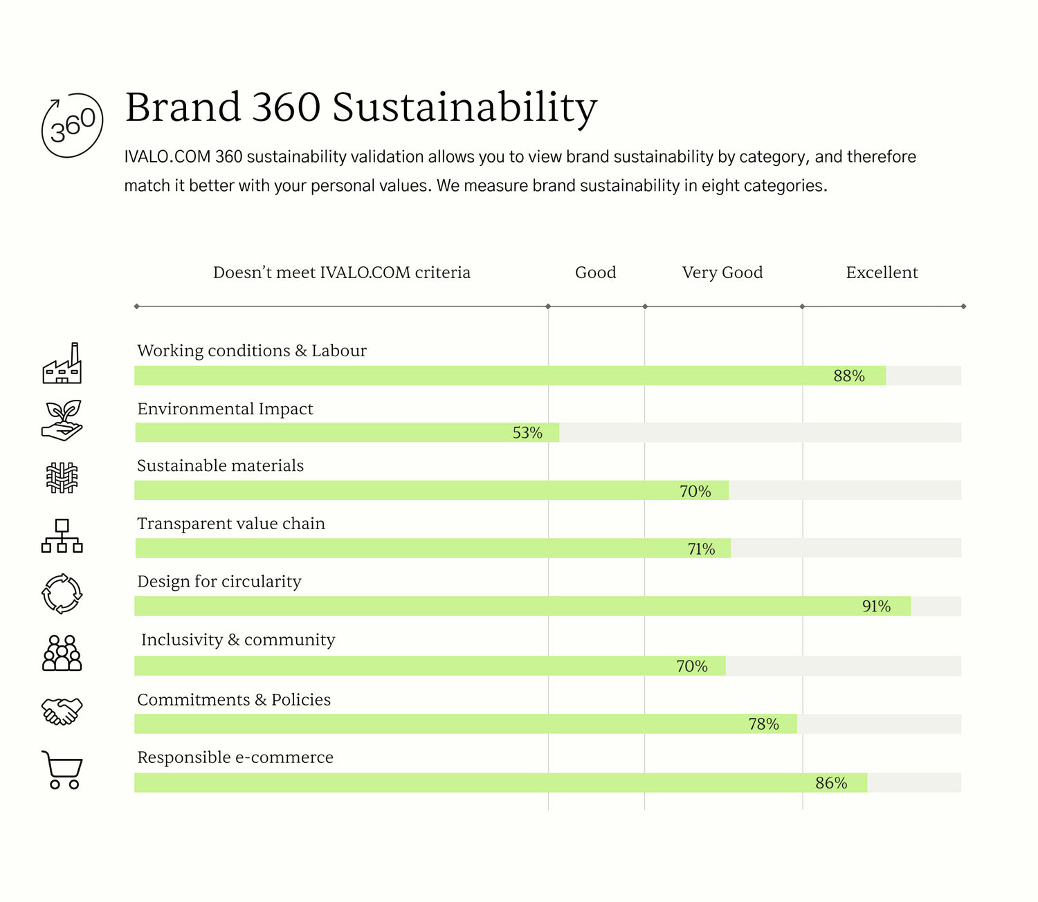 IVALO.COM 360 -validointi antaa brändille runsaasti tietoa oman vastuullisuutensa kokonaisvaltaisesta tilasta ja auttaa samalla asiakasta löytämään omiin arvoihinsa sopivaa pukeutumista.