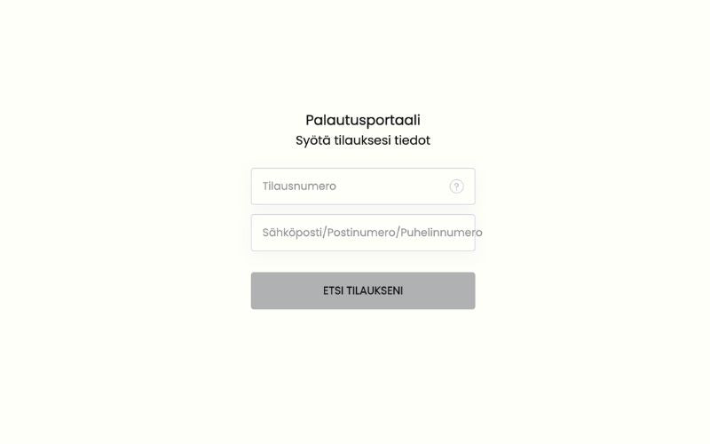 Syötä tilausnumerosi (löytyy tilausvahvistuksesta #-symbolin jälkeen). Lisää lisäksi tilaukseen liitetty sähköpostiosoite, postinumero tai puhelinnumero.