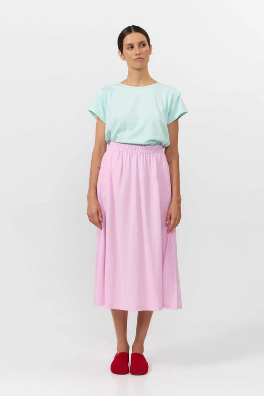 Keskipitkä hame, jonka helmassa on sivuhalkio. Siinä on joustava vyötärönauha paremman istuvuuden takaamiseksi. Se on mukava, hengittävä ja helppo tyylitellä. Yksinkertainen, toimiva ja valmis toistettavaksi.