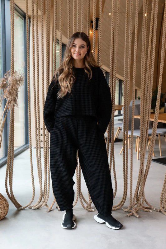 Aiko-housut porkkanatyylillä, mukavat oversize-housut, joissa on hieman kaareva lahje. Aiko-housuissa on leveä ja pehmeä joustava vyötärönauha, ja housuissa on myös taskut. Aiko-housut on valmistettu puuvillaisesta rakenteellisesta hunajakennokankaasta ja yhdessä Aiko Collegepaita kanssa ne muodostavat ihanteellisen vapaa-ajanasukokonaisuuden.