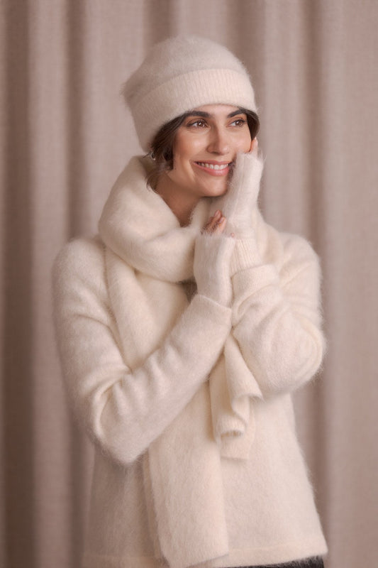 Alpakansekoitteiset Käsineet Kermanväriset tarjoavat poikkeuksellista lämpöä ja pehmeyttä korkealaatuisen alpakansekoitteen ansiosta. Nämä käsineet tarjoavat mukavaa eristystä kylmällä säällä, samalla kun ne sallivat sormien täyden liikkuvuuden, mikä on täydellistä puhelimen käyttöön tai avainten käsittelyyn ilman niiden riisumista. Niiden pörröinen tekstuuri tuntuu hellävaraiselta iholla, tehden niistä käytännöllisen mutta ylellisen asusteen. Yhdistä ne muihin alpakansekoitekokoelman osiin saadaksesi yhtenäisen ja tyylikkään talvilookin.