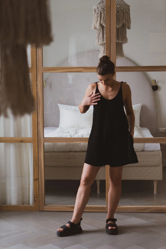Lyhyt housut, joissa on säädettävät olkaimet, taskut ja leveät lahkeet. Olkaimet mahdollistavat pituuden ja leveyden valinnan, voit käyttää sitä paidan tai bikinin päällä tai erikseen.