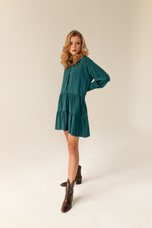 Anais vihreä silkkimekko löysässä leikkauksessa röyhelöillä. Mekossa on napitettu paitayläosa ja pystykaulus, hieman laskettu olkapää, hihat pidemmällä kalvosimella, joka kiinnitetään 3 napilla. Mekkoa voi pitää vapaana tai vyöllä sidottuna, se on mukautettu avoimen kaula-aukon käyttöön. Mekko on valmistettu lihavasta viskoosista syvän merenvihreässä värissä. Kaikki napit on päällystetty kankaalla, viskoosivuori.