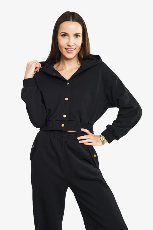 Short sweatshirt made of high-quality knit. The loose oversize cut guarantees comfort and adds lightness to the styling. Decorative gold snaps along the front emphasize the unique style of the sweatshirt. Voluminous sleeves are finished with ribbed cuffs, and the hood is decorated with the gold Mandragora logo.