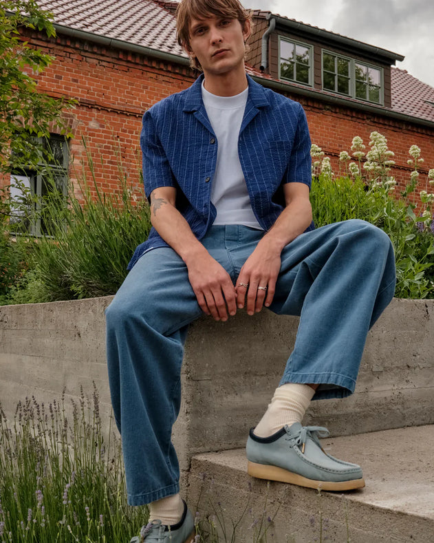 Rennon mallinen lyhythihainen paita, jossa on keilakaulus, valmistettu raidallisesta luomupuuvillaisesta seersucker-kankaasta ja taguapalmun pähkinästä valmistetuista napeista. Vasemmassa rinnassa paikkatasku.