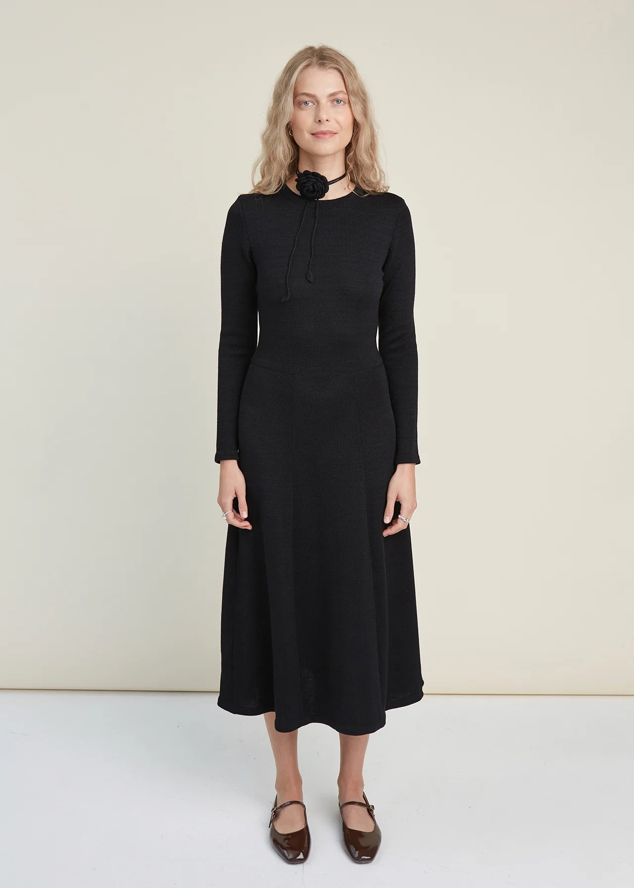 Knitted Merino Wool A-line Midi Dress Black