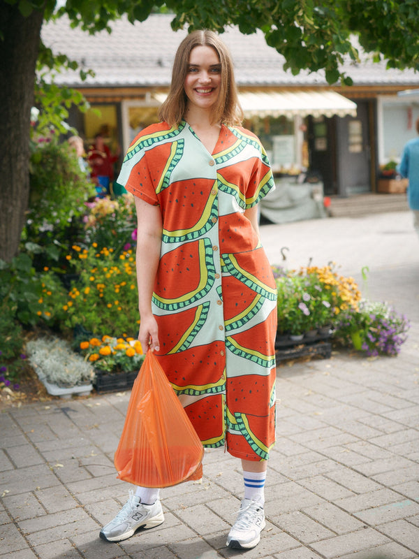 Rento suoralinjainen jersey-mekko napituksella ja irrotettavalla vyöllä. Herkullinen punainen ja vihreä vesimelonikuvio on täydellinen kesäpäiviin.