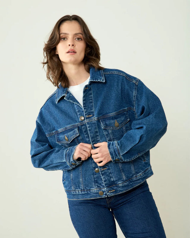 Dark Denim Jacket in pre-sale, arriving March 2. Crafted from sustainable BCI cotton with contrasting yellow stitching and copper buttons. Features a classic bomber silhouette with side pockets, ideal for layering. Ethically produced using closed-loop processes. Machine wash cold, lay flat to dry.