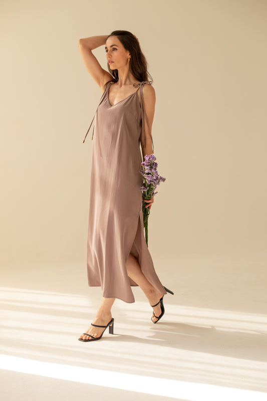 Mekko on maksimittainen ja siinä on halkiot molemmilla puolilla, jotka ulottuvat reiteen asti, ohuet solmittavat olkaimet, jotka on viimeistelty koristeellisella kultaisella kärjellä. Se on valmistettu pehmeästä ja laskeutuvasta cupro-viskoosista, jossa on ns. viileä kosketus.