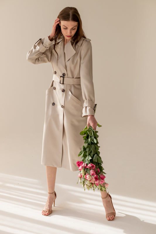 Vaalea beige silkkinen trenssitakki on klassinen elegantti pitkä takki, joka on valmistettu silkkitvillistä. Takissa on hieman väljempi leikkaus, siinä on tiukasti vedetty kaulus ja olkapaikat. Takissa on kaksirivinen nappikiinnitys. Lisäksi siinä on pitkä solkivyö vyötäröllä ja solkiremmit hihoissa, joita voi säätää.