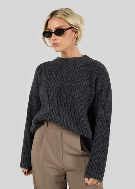 Rennot hihat ja hienovarainen laskeutuvuus lupaavat lisätä helppoa eleganssia jokapäiväiseen ilmeeseesi. Saatavana syvän hiilenharmaana, tämä villapaita sopii hyvin räätälöityjen housujen, farkkujen tai minkä tahansa suosikkihameen kanssa, varmistaen hienostuneen ulkonäön mukavuudesta tinkimättä.