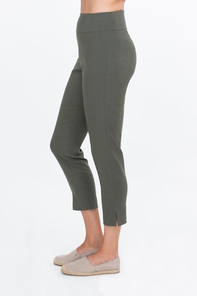 The Eeva Slit Capri Trousers offer a sleek and modern look. These slim capri pants provide comfortable wear with their stretchy viscose blend material and supportive wide double waistband. Slits at the leg openings.