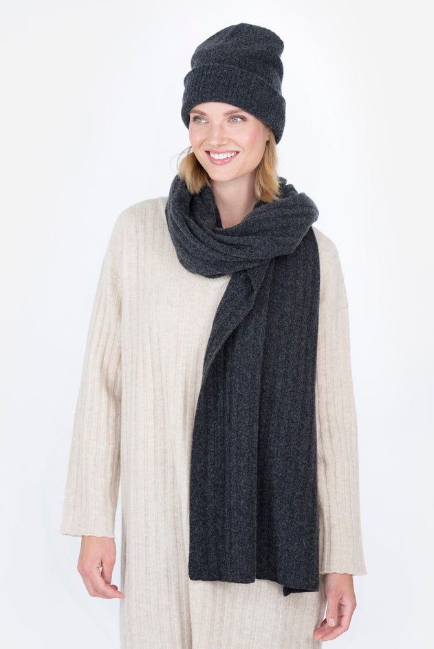 The PITKOS Knitted Scarf, in a shade of rich dark grey, has been expertly designed using a broad rib stitch. This ensures a sturdy yet stylish piece. FALLA FINLAND uses a high-quality wool-cashmere blend for the yarn, providing an exceptional quality and feel.