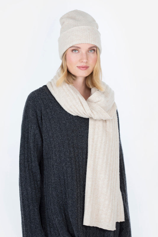 The PITKOS Knitted Scarf in soft beige hue is a product of FALLA FINLAND. This plush scarf is crafted with a wide rib-knit design, providing a luxurious and comforting experience. The yarn used in its creation is a high-quality blend of wool and cashmere, ensuring utmost warmth with a touch of elegance.
