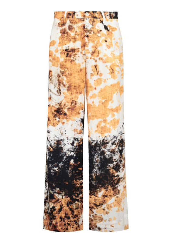Leveälahkeiset housut, joissa on kauniisti laskeutuva Framtiden-kuvio. Valmistettu 100% EcoVero-materiaalista, joka on mukava, hengittävä ja jämäkkä. Täyspitkät, suorat leveät lahkeet liikkuvat sulavasti kävellessäsi. Vyötärökaistaleessa on vyölenkit, takalaskokset ja joustava nauha lisätilaa varten. Housuissa on vetoketju ja nappikiinnitys.