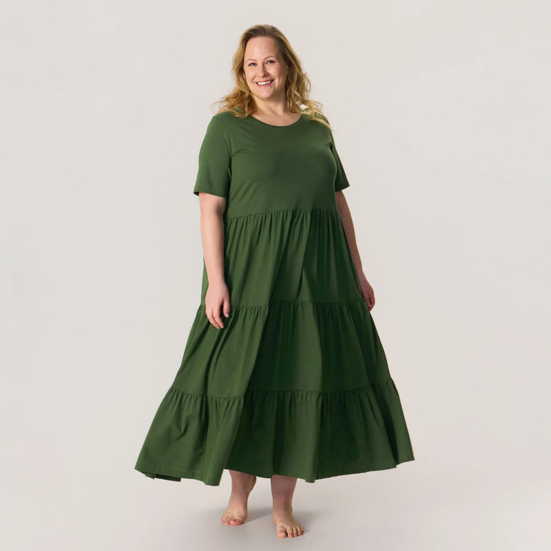 Frill-mekko on kevyt ja viehättävä – täydellinen vaate hetkiin, jolloin haluat antaa hameesi pyöriä ja askeltesi keventyä! Yläosa on hieman istuva, ja vyötäröltä alkava frilla tuo mekkoon ilmavuutta. Frill-mekossa on T-paidan hihat, pyöreä pääntie ja tietysti käytännölliset taskut molemmilla sivusaumoilla. Maksimitta peittää jalat ja liikkuu kauniisti, kun pyörähdät. Valmistettu kevyestä ja ohuesta puuvilla-modal-neuloksesta.