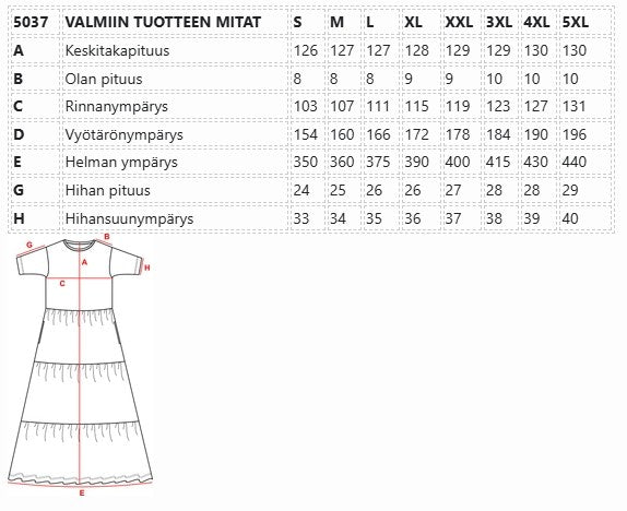 | 5037 | VALMISTETUN TUOTTEEN MITAT | S | M | L | XL | XX | 3XL | 4 | 5 |