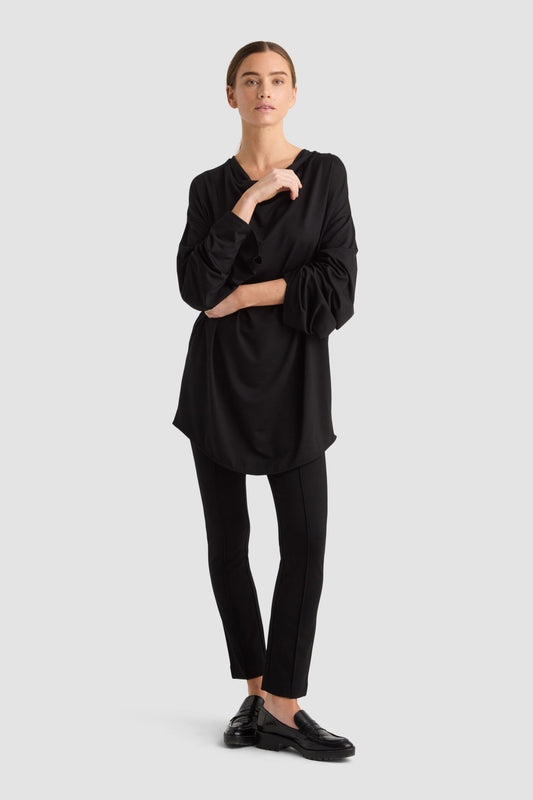 Gennova Top Musta esittelee tyylikkään pitkän siluetin, jossa on kevyesti laskeutuva kaulus, joka lisää ripauksen hienostunutta eleganssia vaatekaappiisi. Sen pitkät, väljät hihat tarjoavat mukavuutta, kun taas pyöristetty helma tuo modernin, imartelevan viimeistelyn. Suunniteltu heijastamaan huoliteltua, vaivatonta muotia, tämä paita tasapainottaa tyylin ja mukavuuden saumattomasti.