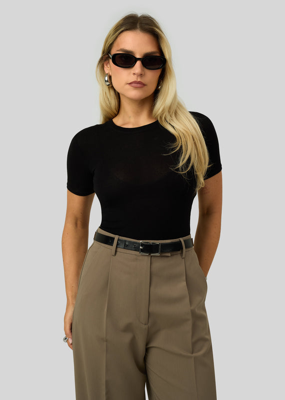 Tämä musta 90-luvun tyylinen T-paita on suunniteltu tuntumaan kuin toinen iho. Se on valmistettu erittäin pehmeästä, voimakkaasta deadstock-kankaasta, joka liukuu kehon yli tarjoten tuskin havaittavan tunteen. Sen kevyt tekstuuri luo sileän, veistoksellisen istuvuuden. T-paidassa on hieman läpikuultava vaikutus sen erittäin kevyen kankaan ansiosta.