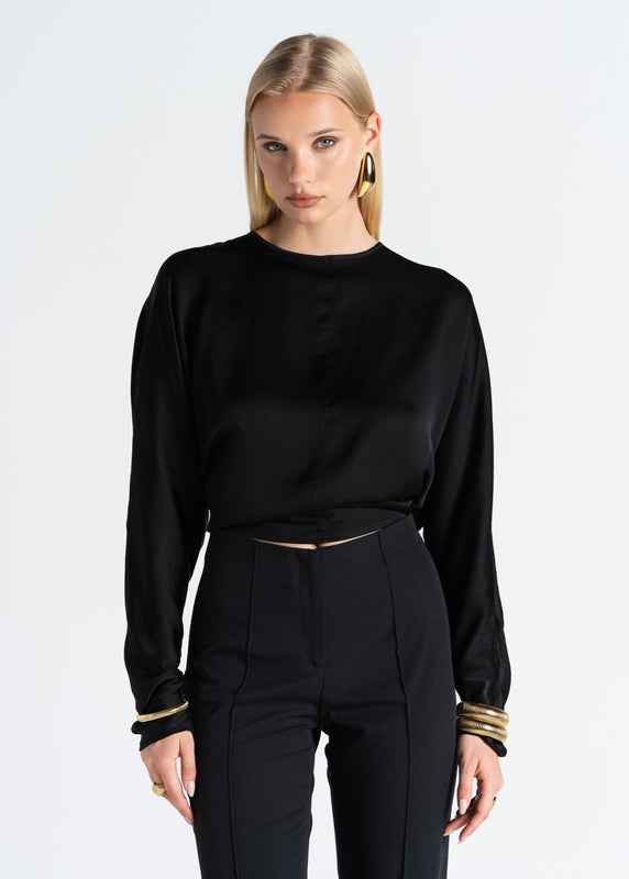 Halo-pitkähihainen satiinipusero edustaa modernia minimalismia ripauksella hiljaista draamaa. Se on valmistettu sileästä satiinista, ja siinä on puhdas etuosa ja pehmeästi laskeutuvat pitkät hihat. Takana herkkä solmuke kiristää siluettia, lisäten rakennetta, liikettä ja hienovaraista vetovoimaa.