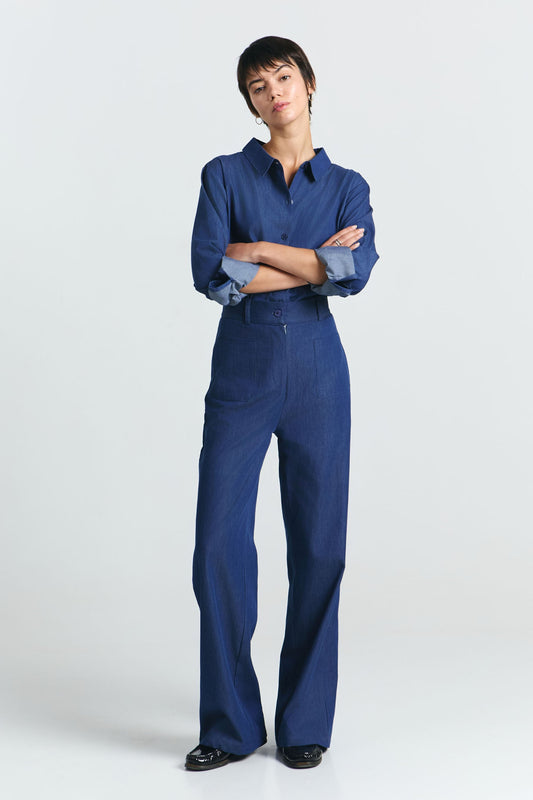 Korkeavyötäröiset 70-luvun tyyliset rento sininen farkut, jotka on valmistettu tukevasta luomupuuvillafarkusta.