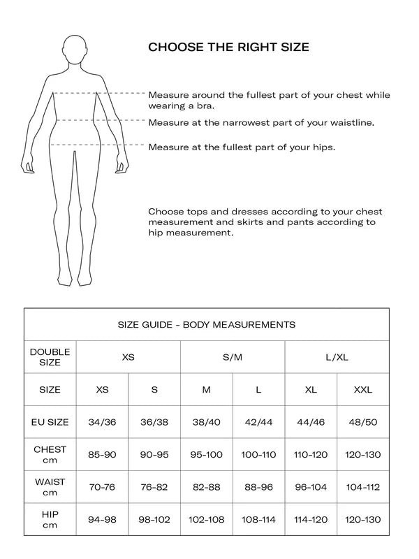 Nettiostoksilla kannattaa turvautua mittanauhan tai verkkokaupan kokotyökalun apuun. Tarkista vaatemerkin kehon mittojen mukainen kokotaulukko ja vaatteen mitat, jos ne ovat saatavilla. Ole tarvittaessa yhteydessä asiakaspalveluumme tarkempien mittojen saamiseksi.