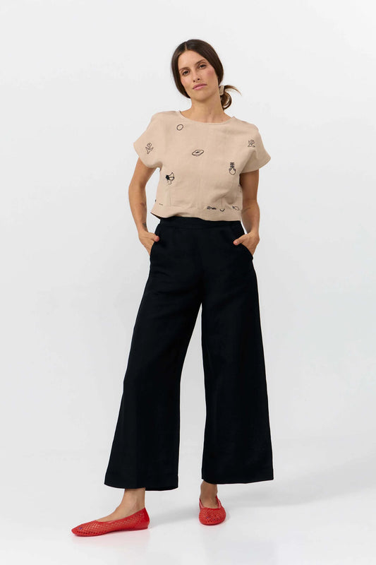 Kirjontainen cropped-toppi, jossa on pudotetut olkahihansuut ja pyöreä pääntie. Takana on sulkeminen yksityiskohtaisesti vegaanisella corozo-pähkinänapilla. Se on mukava, hengittävä ja helppo tyylitellä. Luotettava kappale, joka sopii päivittäisiin rutiineihin.