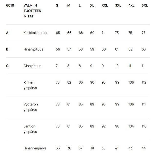 Eri vaatemerkkien mitoitus voi vaihdella keskenään. Yhden merkin koko M voi olla toisen merkin S. Useimmilla IVALO.COMissa myytävillä brändeille on oma kokotaulukko, jonka löydät tuotesivulta. Vertaa omia mittojasi merkin mittataulukkoon.