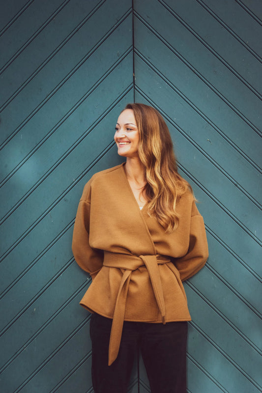 Lyhyt Vaaleansininen villasekoitetakki, jossa on laskettu olkapäälinja ja irrotettava vyö. Sopii hyvin käytettäväksi yksinään keväällä ja syksyllä tai lisäkerroksena talvitakin alla. Takki on miellyttävän väljä ja siinä on hieman pidempi leikkaus sivuilla.