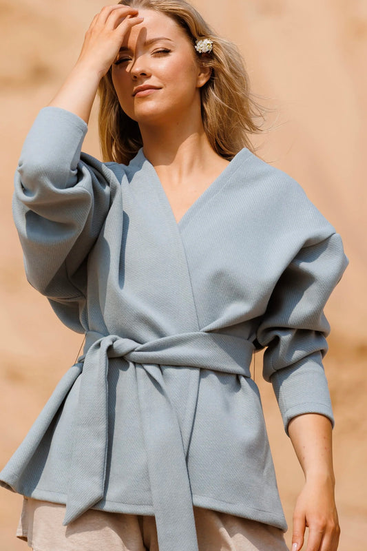 Lyhyt Vaaleansininen villasekoitetakki, jossa on laskettu olkapäät ja irrotettava vyö. Sopii erinomaisesti yksinään kevääseen ja syksyyn tai lisäkerrokseksi talvitakin alle. Se on miellyttävän väljä, ja siinä on hieman pidempi leikkaus sivuilla.