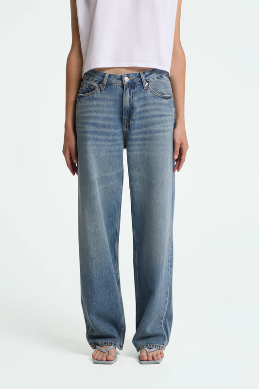 The JOAN jeans feature a high-rise waist and a straight leg that gently flares at the ankle, creating a flattering silhouette with retro undertones. Made from an organic cotton blend, they offer a soft feel with enough structure to hold their shape. Vintage shape, modern mindset.