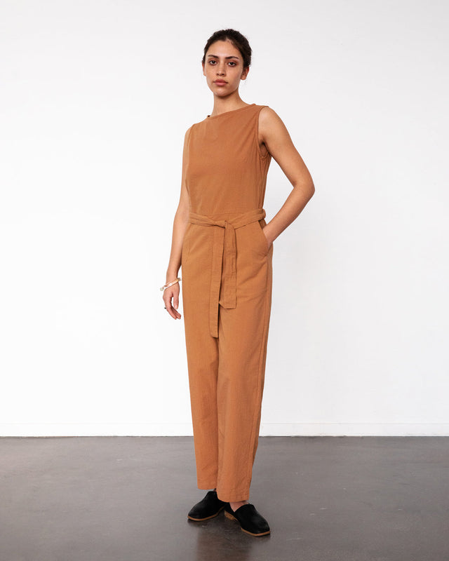 Kesäinen haalari, joka on valmistettu kevyestä, orgaanisesta puuvillaseersucker-kankaasta, joka on kudottu Portugalissa. Moderni, suora siluetti ja leveät lahkeet tarjoavat runsaasti liikkumisvapautta ja mukavan tunteen. Lahkeet ovat hieman lyhennetyt. Yksinkertainen vyö voidaan solmia eteen tai taakse. Varustettu käytännöllisillä sivutaskuilla ja vetoketjulla takana