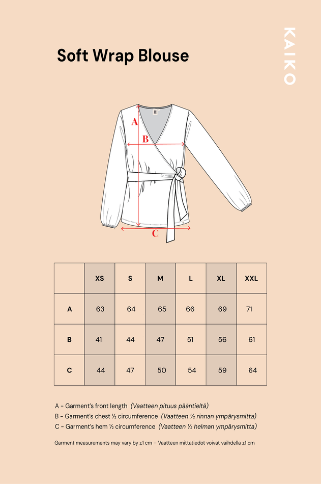 Nettiostoksilla kannattaa turvautua mittanauhan tai verkkokaupan kokotyökalun apuun. Tarkista vaatemerkin kehon mittojen mukainen kokotaulukko ja vaatteen mitat, jos ne ovat saatavilla. Ole tarvittaessa yhteydessä asiakaspalveluumme tarkempien mittojen saamiseksi.