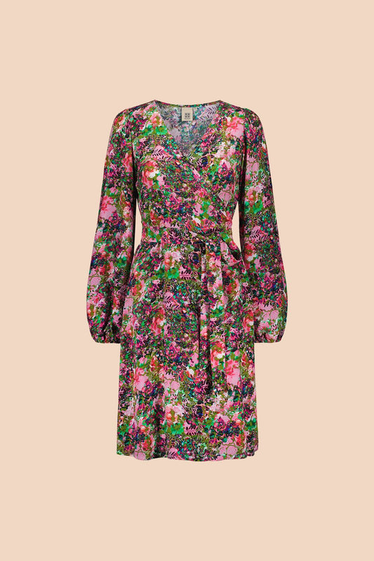 Tyylikäs ja naisellinen kietaisumekko on valmistettu kauniisti laskeutuvasta kudotusta kreppikankaasta. Mekossa on imarteleva kietaisuleikkaus, ja vyötärö voidaan säätää henkilökohtaisen mieltymyksen mukaan vyötärönauhan avulla. Mekossa on löysät täyspitkät hihat, joissa on kuminauhakokoonpanot, ja olkapäällä on kokoontumista, mikä luo kauniin volyymin hihoihin. Helman pituus on noin polvipituinen. Kietaisumekon Blooming Forest Bright -kuosi on kerroksellinen ja värikäs.