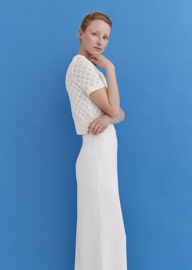 Neulesetti, joka sisältää valkoisen lyhythihaisen pitsitopin ja maksihameen. Valmistettu vähävaikutteisesta ZERO®-puuvillasta – se on pehmeä, luonnollinen ja tuntuu kevyeltä keholla ja lempeältä iholla.
