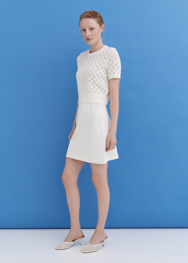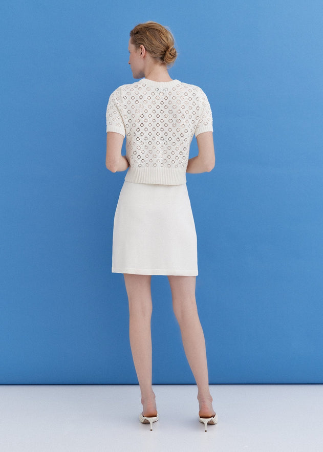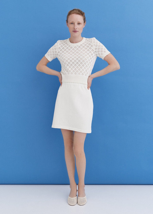Tämä neulottu minihame on tehty kesäillan rauhallisuutta ajatellen. Se hiljainen hetki, kun tuuli pehmenee, kaikki hidastuu ja tunnet olosi täysin rentoutuneeksi. Se on tunne tämän vaatteen takana – kevyt, vaivaton ja ajaton.