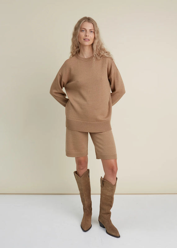 Tässä puhtaasta merinovillasta valmistetussa vaivattomassa setissä yhdistyvät rento pusero, jossa on pudotetut olkapäät ja Ribbi yksityiskohdat, sekä shortsit, joissa on säädettävä kiristysnauha ja viimeistellyt lahkeet. Luonnollisesti hengittävä ja lämpötilaa säätelevä, se on suunniteltu kiireettömiin päiviin ja saumattomaan kerrostamiseen.