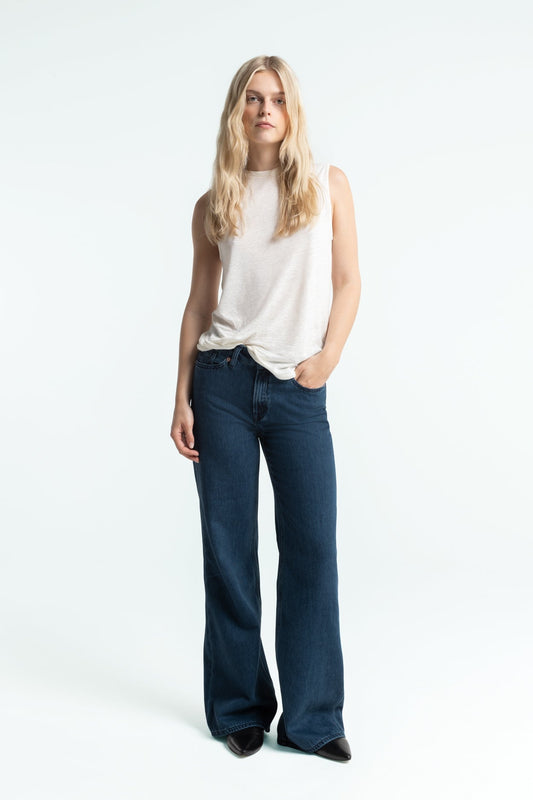 Jane Jeans Alex Dark Worn -farkuissa on leveä levenevä istuvuus ja keskikorkea vyötärö, ja ne on valmistettu 100% luomupuuvillasta. Tummansininen denim sopii hyvin moniin asuihin, ja se on helppo yhdistää rentoihin tai juhlavampiin yläosiin.