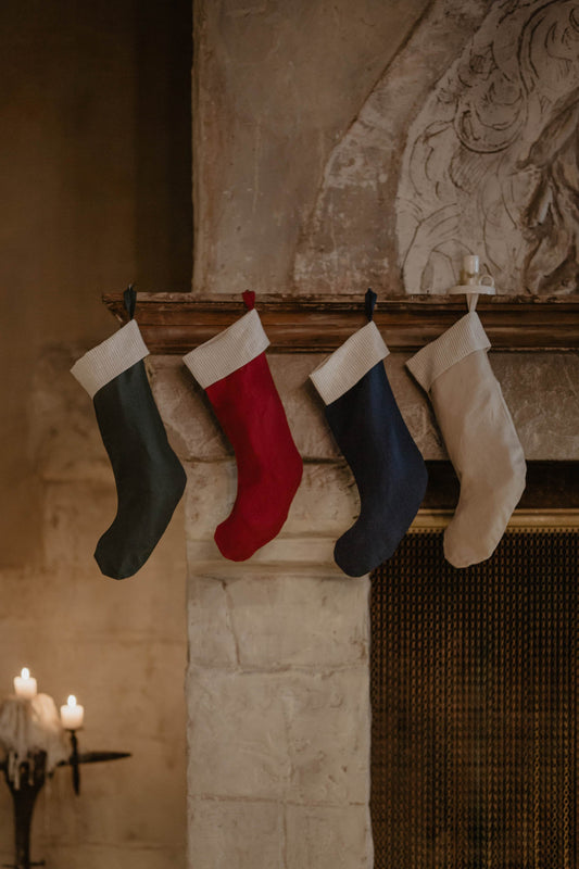 100% linen Christmas stockings with a striped cuff and a loop for hanging. Beautiful linen stockings for the most beautiful season of all. Decorate your home this Christmas by choosing sustainability- linen is durable and, if taken care of properly, can last a lifetime. Hang your Christmas stocking on a fireplace, a wall or doors or use it as an eco-friendly packaging for under the tree.