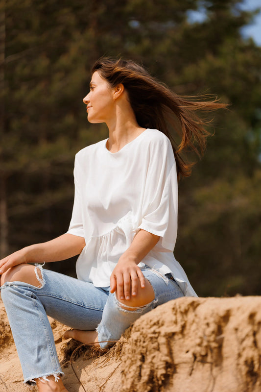 Liisa on löysä, röyhelöyksityiskohtainen T-paita, joka on valmistettu puuvillasatiinista ja siinä on hienovarainen kiilto.