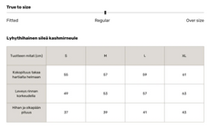 Nettiostoksilla kannattaa turvautua mittanauhan tai verkkokaupan kokotyökalun apuun. Tarkista vaatemerkin kehon mittojen mukainen kokotaulukko ja vaatteen mitat, jos ne ovat saatavilla. Ole tarvittaessa yhteydessä asiakaspalveluumme tarkempien mittojen saamiseksi.