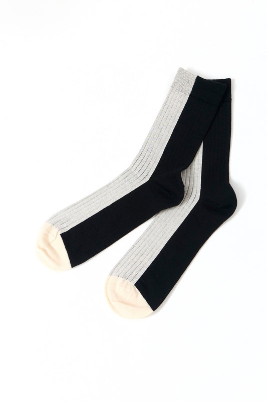 Puoliväliin ulottuvat kaksiväriset puuvillasukat Ribbi. Kangas tuntuu kevyeltä iholla ja siinä on helppo liikkua. Luotettava kappale, joka sopii arkirutiineihin.