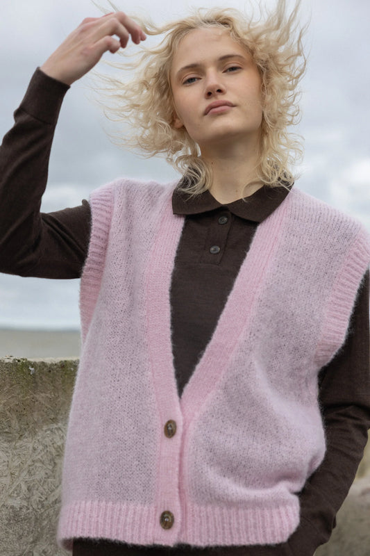 A wardrobe essential woven from premium kid mohair, the Melody vest offers exceptional softness and year-round versatility. Its relaxed One Size cut adapts to layering over any base layer—from fitted tees to structured shirts—while distinctive logo buttons provide understated sophistication. Handcrafted by women artisans across Europe, this piece represents thoughtful design for those who value quality and sustainability.