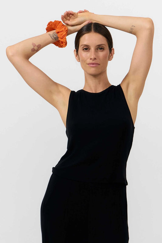 Vaivaton hihaton Ribbi-toppi, jossa on klassinen pyöreä pääntie ja silmiinpistävä avoin selkä. Tässä mukavaan ja monipuoliseen käyttöön suunnitellussa kappaleessa yhdistyvät minimalistinen muotoilu ja jokapäiväinen käyttömukavuus - vaatekaapin olennainen osa, joka on suunniteltu kerrostettavaksi ja toistettavaksi.
