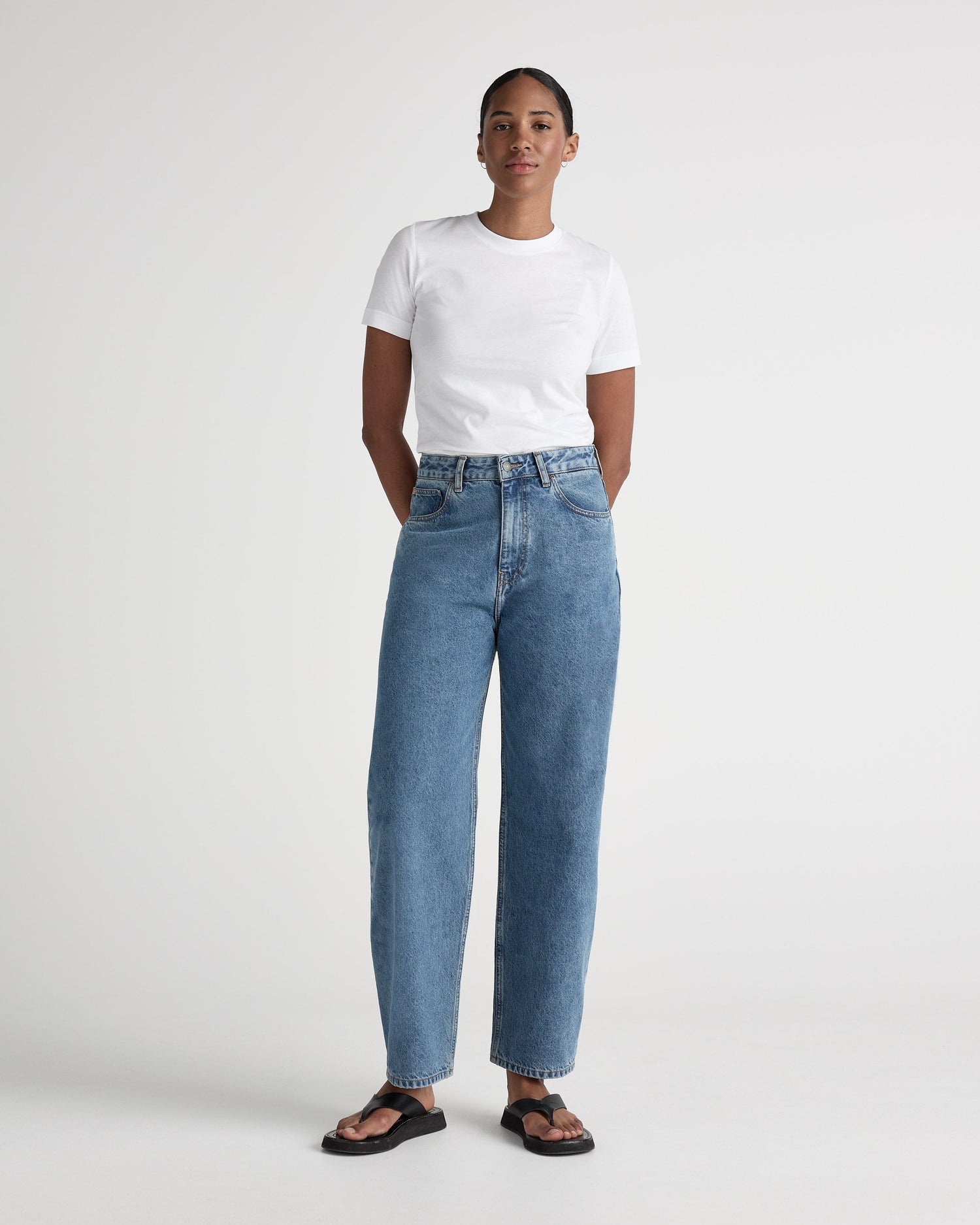 Brooke High Barrel on suunniteltu vyötäröä myötäilevällä korkealla nousulla, siistillä kaarevalla lahkeella ja leikatuilla nilkoilla. Kokonaisvaikutelma on muodikas ja hieman kurvikas muoto. Valmistettu omaleimaisesta joustamattomasta, pyöreästä ja orgaanisesta puuvillasta.