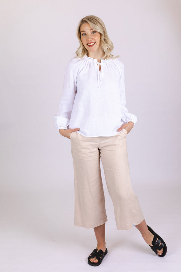 Culottesin ilmava ja löysä leikkaus tarjoaa mukavuutta ja liikkumisvapautta samalla kun se säilyttää tyylikkään siluetin. Näiden housujen hienostunut mutta rento tyyli on täydellinen erilaisiin asuyhdistelmiin, olipa kyseessä rento päivä kaupungissa tai kevyt illallinen ystävien kanssa. Culottes-housuissa on taskut ja joustava vyötärönauha takana lisämukavuutta varten.