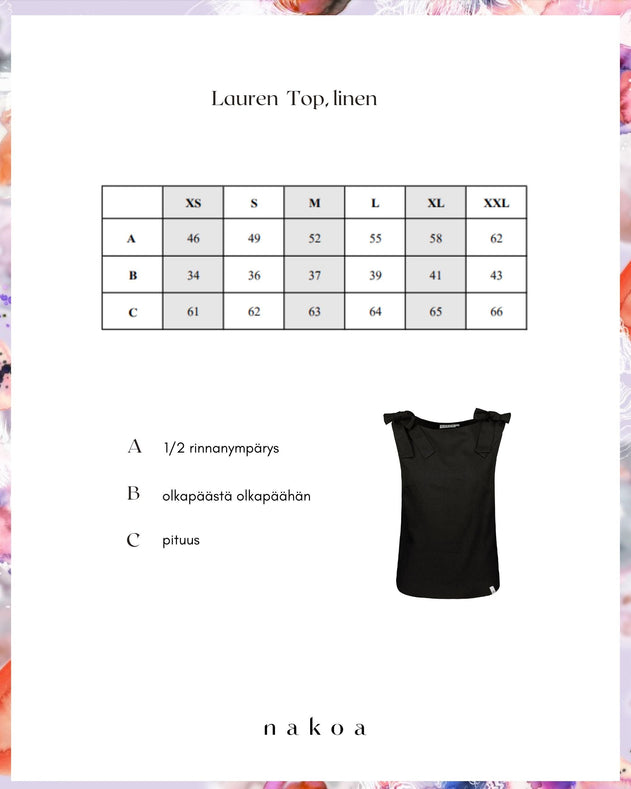 Lauren Top on yksinkertaisesti tyylikäs ja naisellinen sen herkän olkapäillä olevien rusettien ansiosta. Se juhlistaa huoletonta naisellisuutta, ja Lauren Top laskeutuu kauniisti jokaiselle vartalolle.