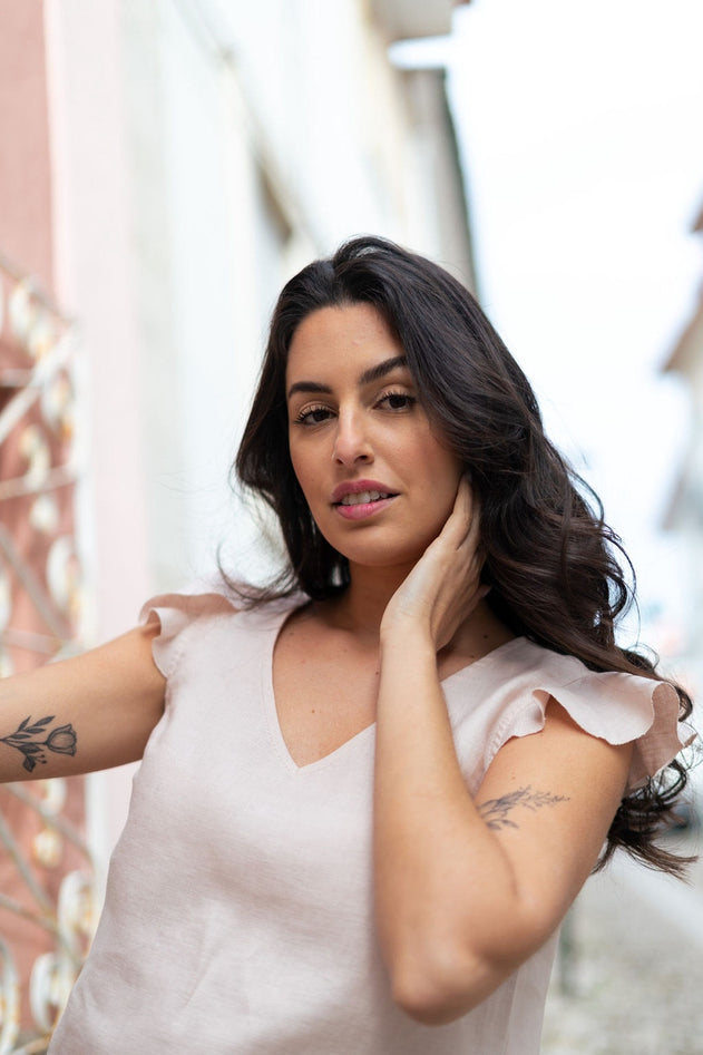Sofia Top on kevyt ja elegantti valinta. Kauniisti kerätyt röyhelöhihat lisäävät leikkisän vivahteen, jota tasapainottaa klassinen V-kaula-aukko rauhoittavalla vaikutuksella. Paita on normaalipituinen, ja siinä on pienet sivuhalkiot lanteilla lisäyksityiskohtana.