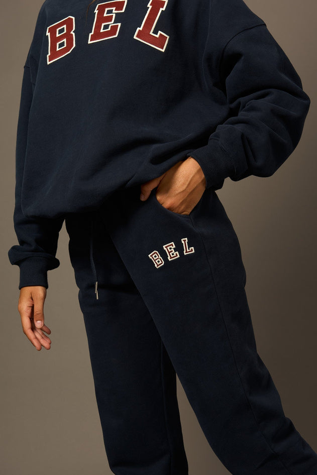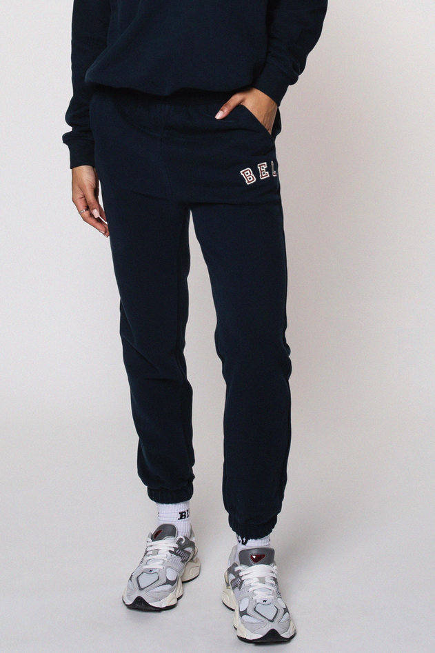 Löydä täydellinen yhdistelmä rentoutumista ja tyyliä näiden laivastonsinisten joggereiden kanssa. Niissä on punainen applikoitu logomerkki vasemmassa etureidessä.